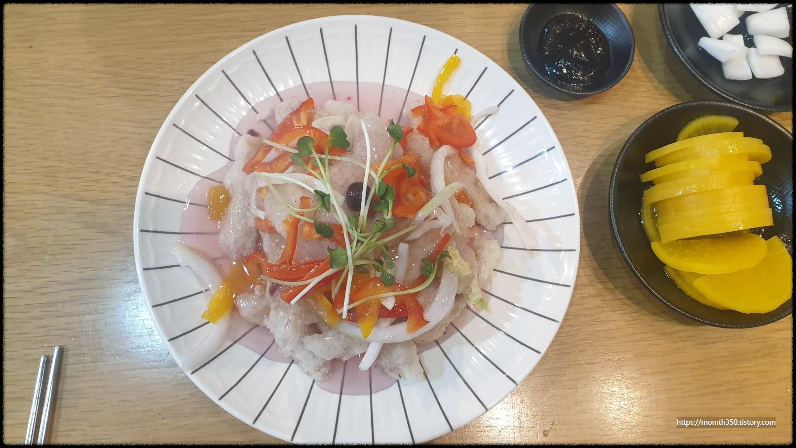 또 하나 맛에 반한 찹쌀로 만든 보라 탕수육이 나왔습니다. 비주얼이 형형색색 파프리카와 잘 어울려 왠지 맛도 새콤달콤할 것 같았습니다. 부어서 소스가 나와서 바삭함이 없을까 걱정했는데, 마지막 하나 먹을 때까지도 바삭바삭함이 살아있고, 야채와 어우러져 느끼한 맛도 전혀 없었습니다.